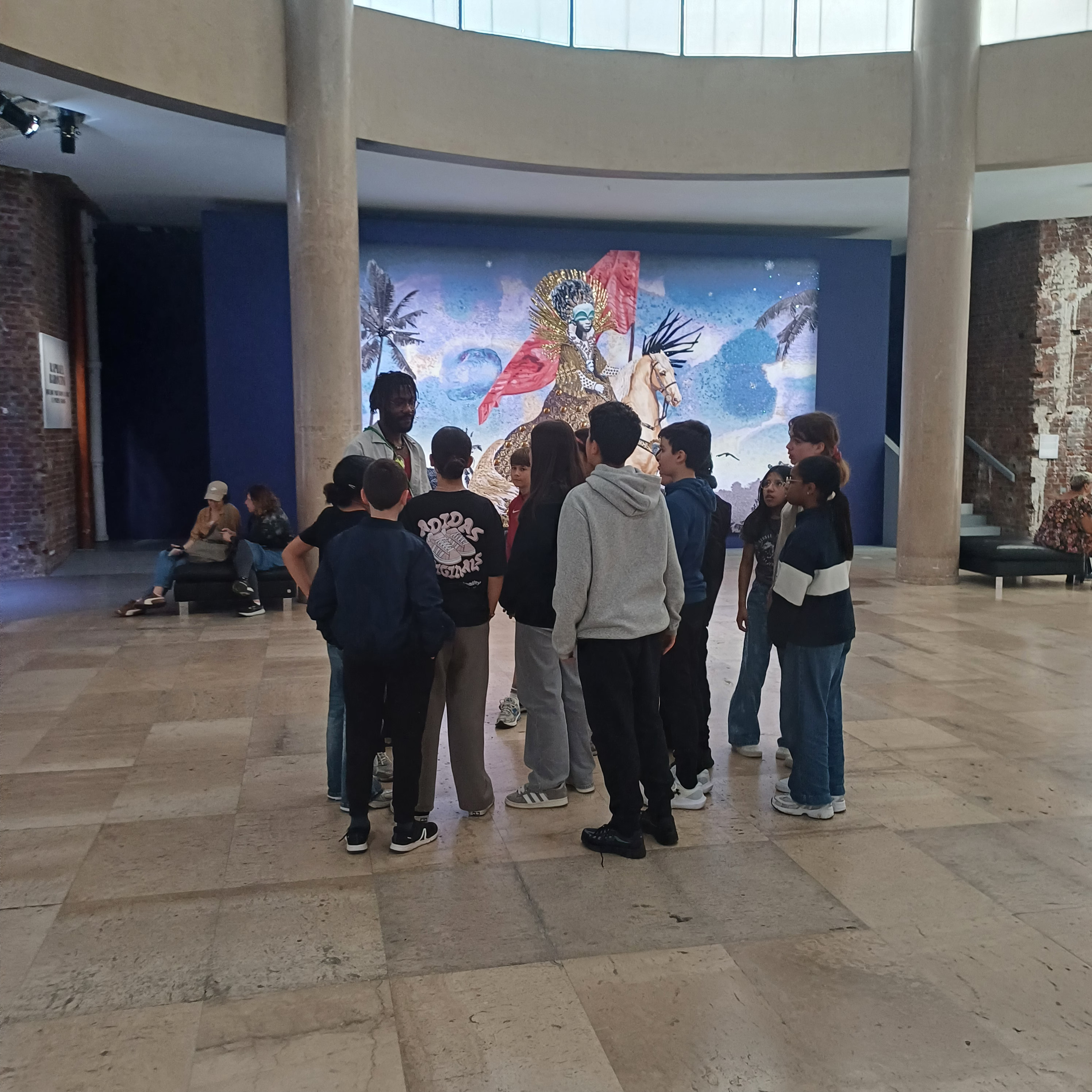 Après une pause ensoleillée dans le jardin du Palais Galliera, les élèves de 6e3 ont découvert lundi 28 avril le travail original du street artist Rammelzee au Palais de Tokyo.